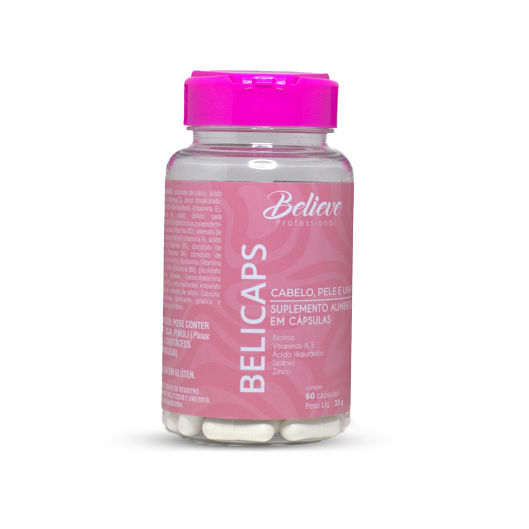 O Belicaps é um suplemento alimentar desenvolvido pela Believe Professional para cuidar da sua beleza de forma prática e eficaz. Sua fórmula exclusiva reúne vitaminas e minerais essenciais que atuam diretamente na saúde do cabelo, pele e unhas, promovendo resultados visíveis e duradouros.