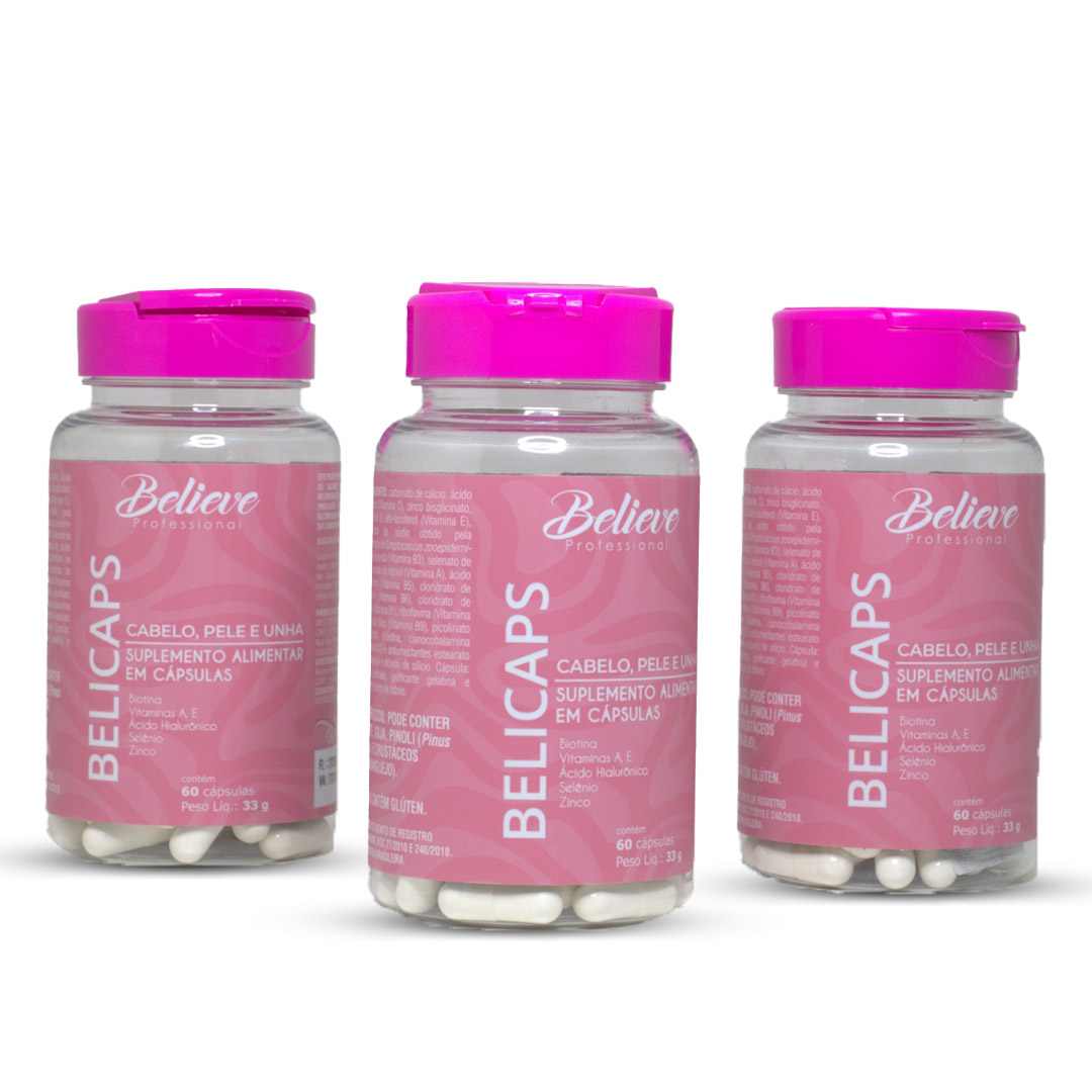 O Belicaps é um suplemento alimentar desenvolvido pela Believe Professional para cuidar da sua beleza de forma prática e eficaz. Sua fórmula exclusiva reúne vitaminas e minerais essenciais que atuam diretamente na saúde do cabelo, pele e unhas, promovendo resultados visíveis e duradouros.