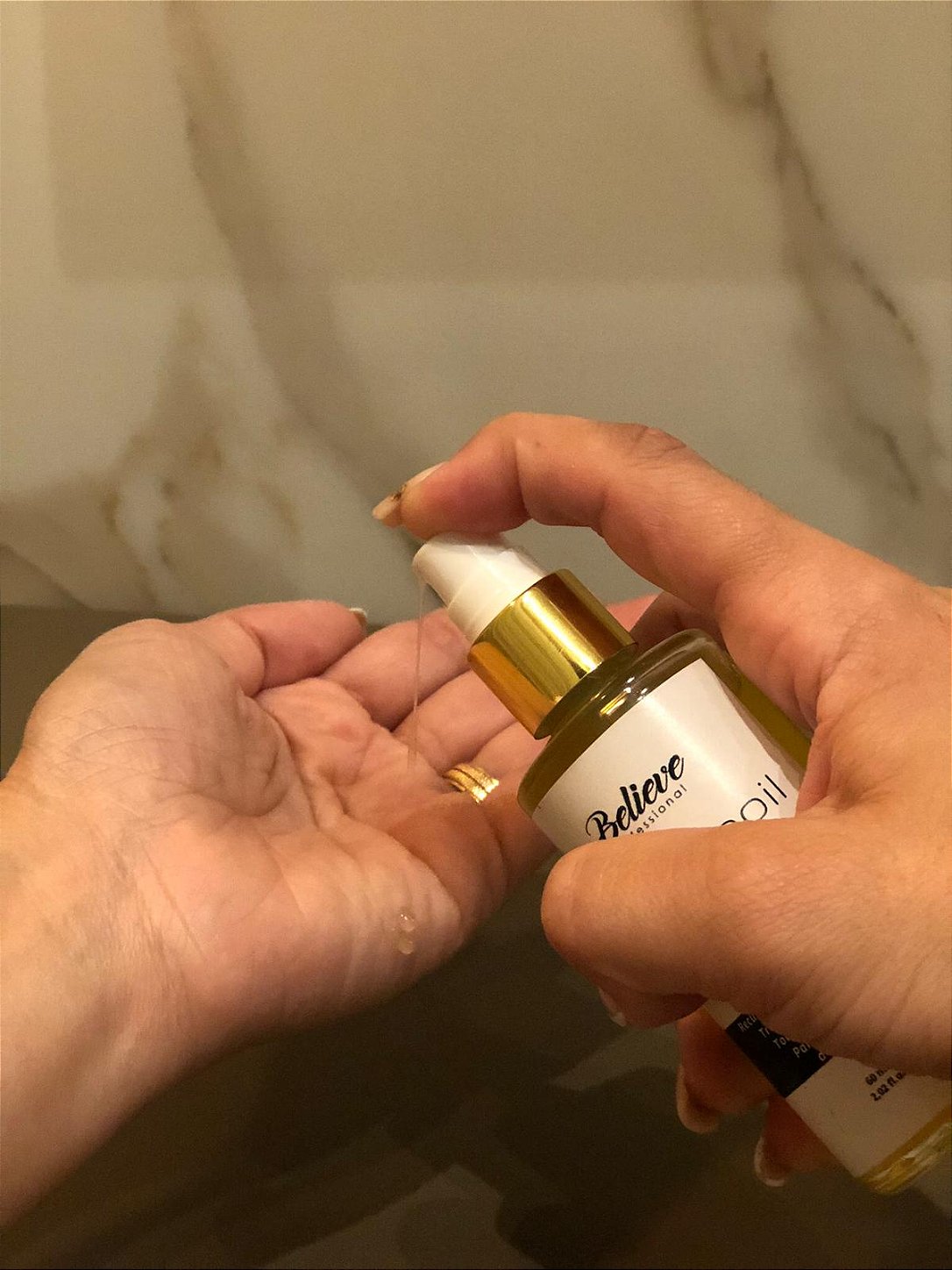 Aplique algumas gotas do Miracleoil nas mãos e distribua nos cabelos secos ou úmidos, do comprimento às pontas.